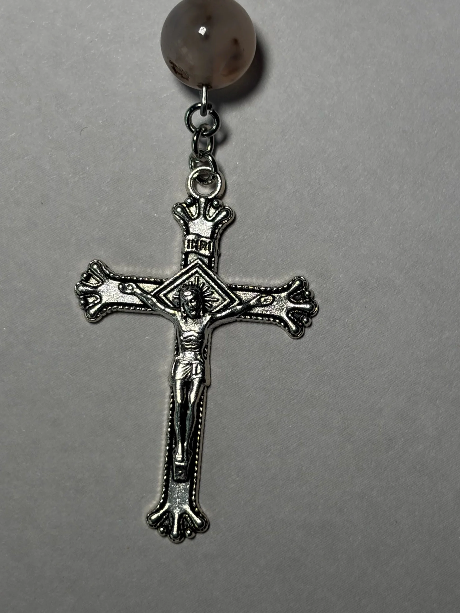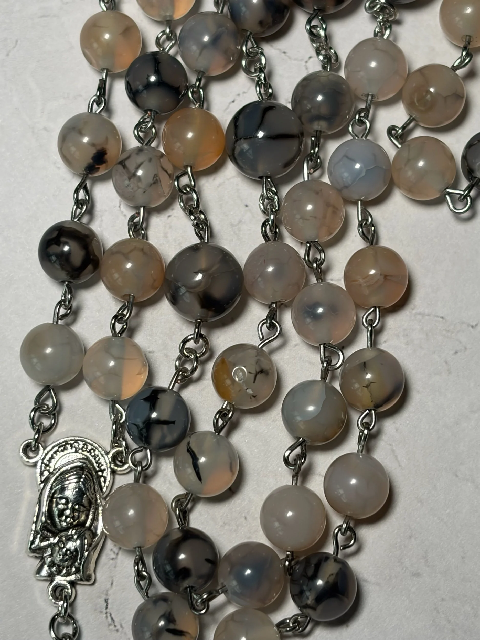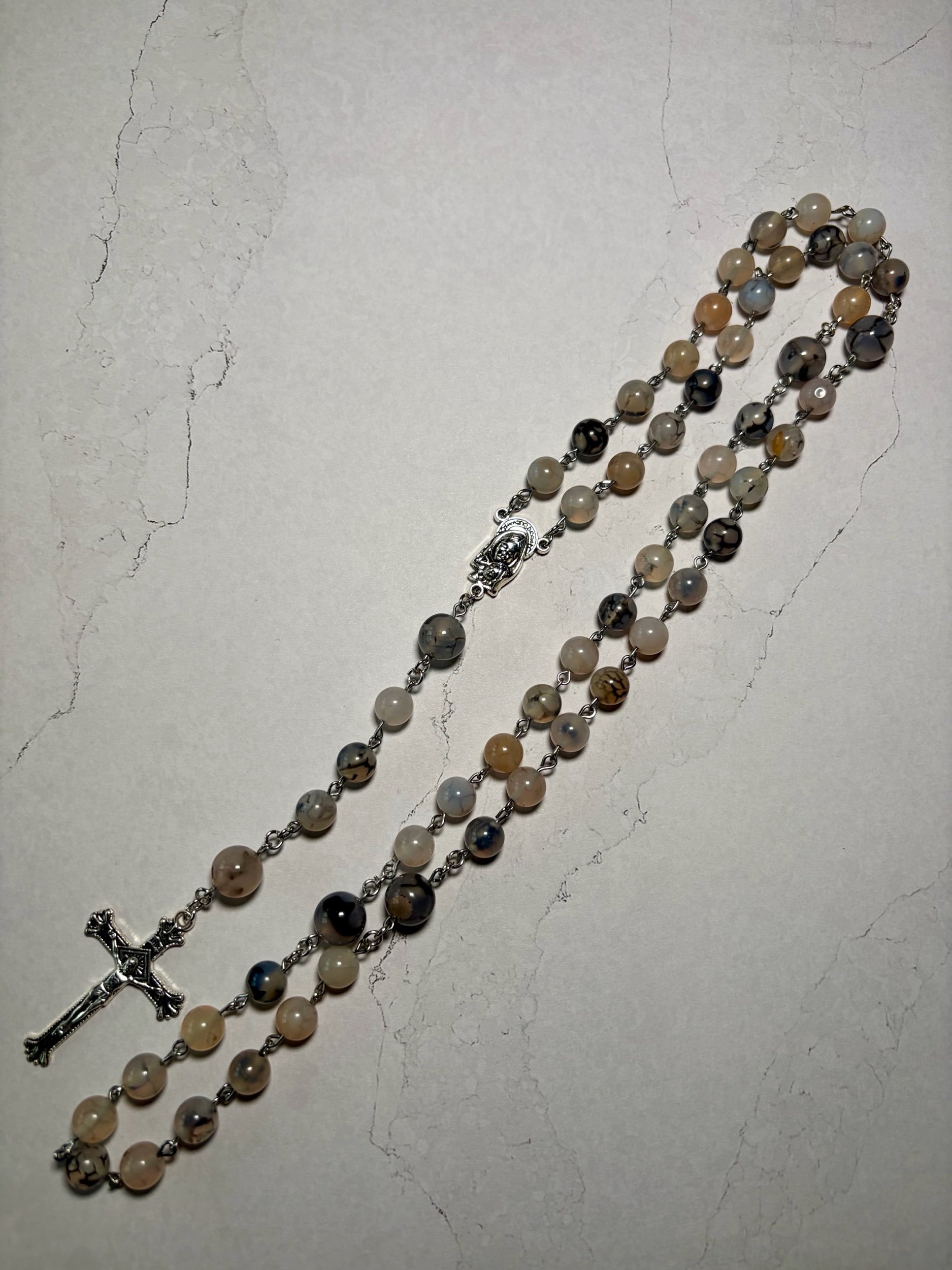 Made with 8mm agate beads and carved howlite turtles (Our Father beads).