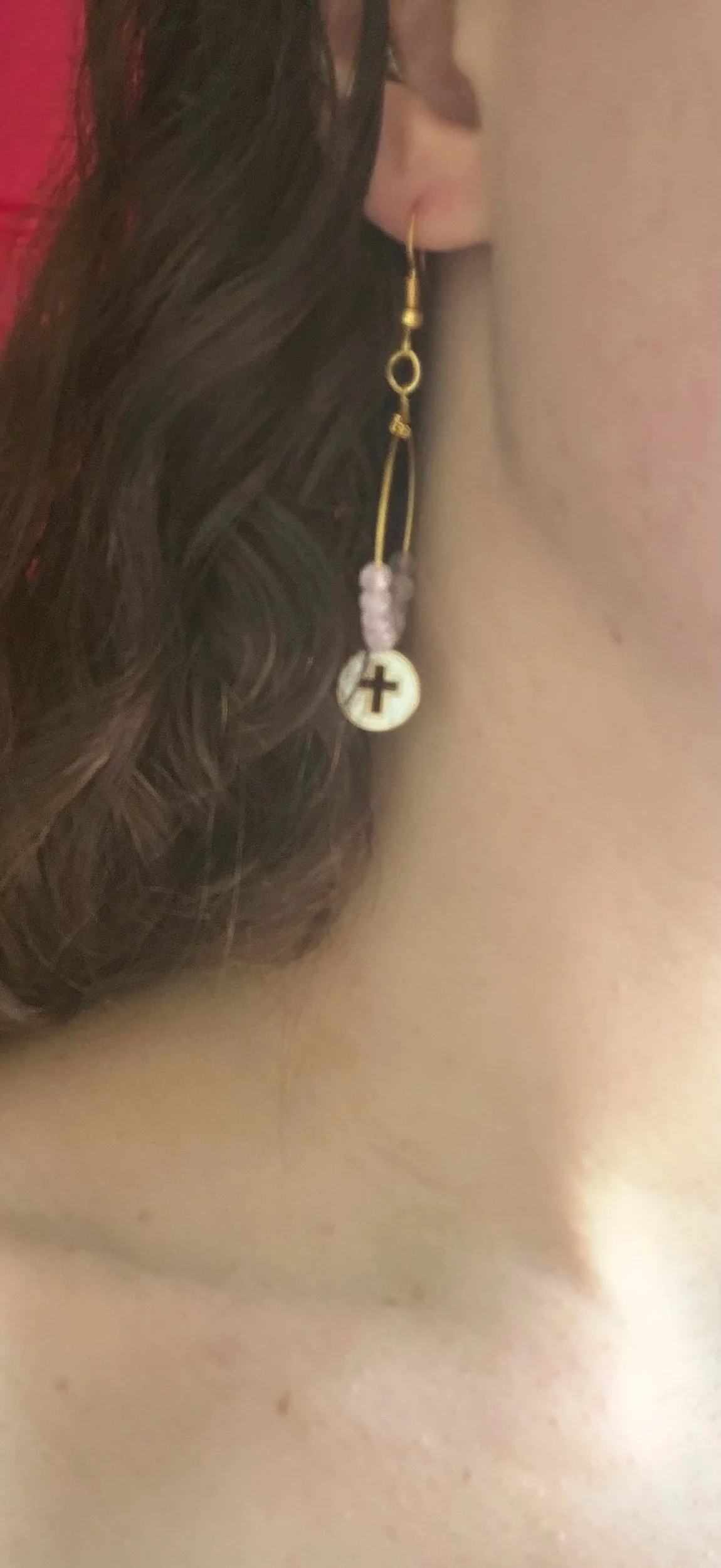 Dangle gold earrings with a medium hoop.
