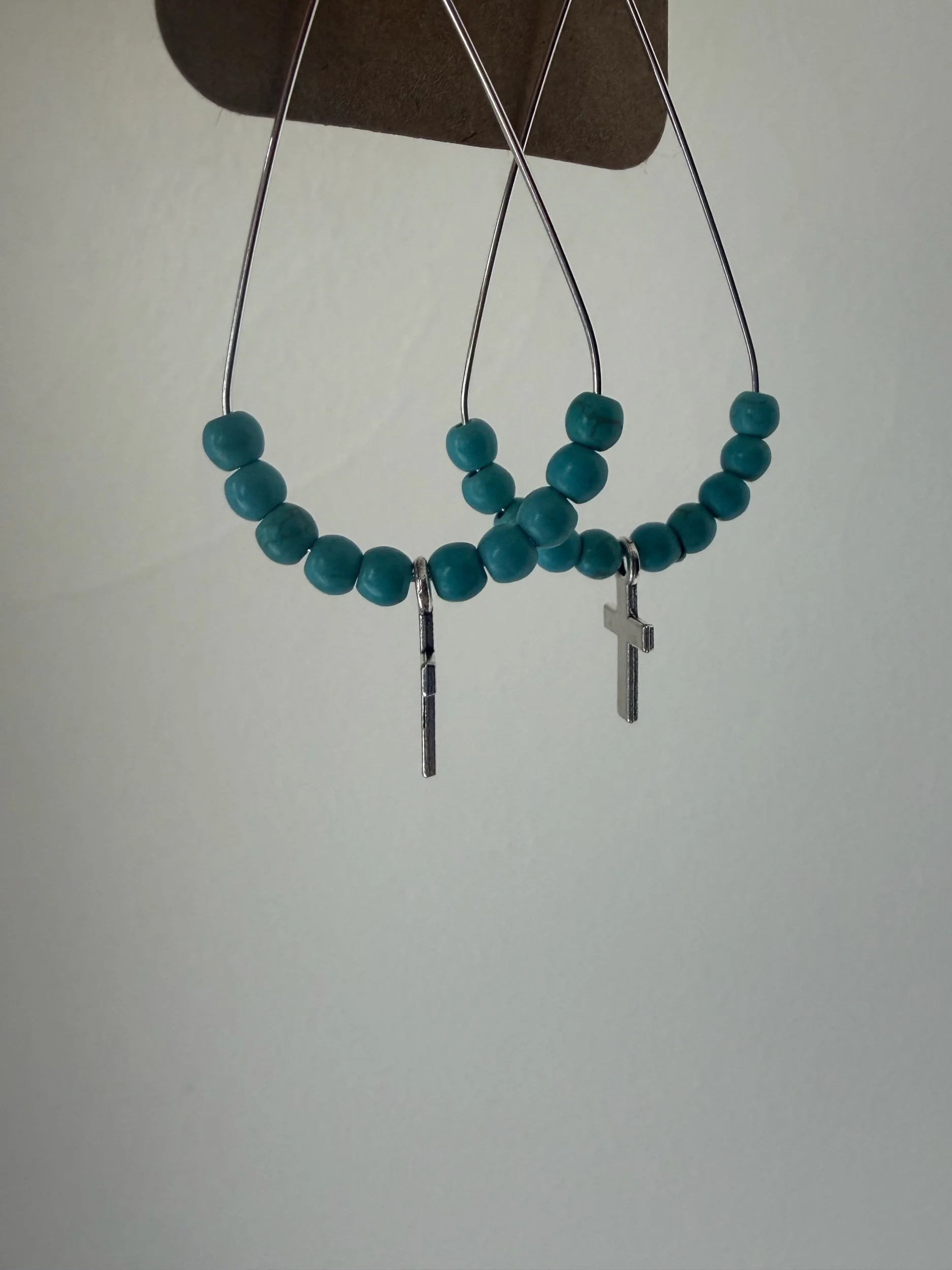 Silver drop earrings with a white shell cross and mini spiral shell.